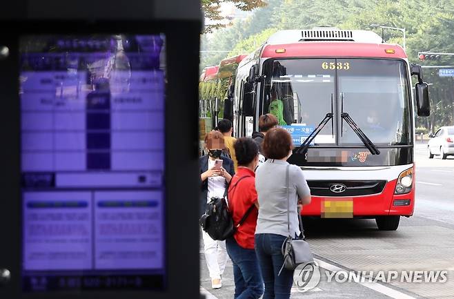 (대전=연합뉴스) 김준범 기자 = 대전시지역버스노동조합이 무기한 파업에 돌입한 30일 오전 대전시 서구 만년동 한 버스정류장으로 전세버스가 들어오고 있다. 2021.9.30