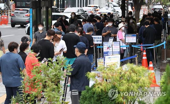 (서울=연합뉴스) 임헌정 기자 = 국내 신종 코로나바이러스 감염증(코로나19) 확산세가 좀체 잦아들지 않는 가운데 30일 오전 서울 송파구 보건소 선별진료소에서 시민들이 검사를 기다리고 있다.