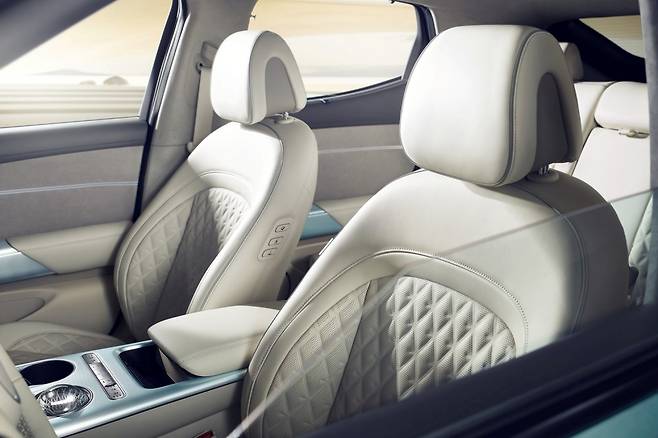 실내는 제네시스 내장 디자인 철학인 '여백의 미'를 바탕으로 섬세하고 차별화된 이미지를 구현했다. 먼저 가장 눈에 띄는 구 형상의 전자 변속기, 크리스탈 스피어다. 시동이 꺼져 있을 때는 무드등이 들어와 크리스탈 오브제로 심미적인 만족감을 준다. 시동 시에는 구 모형이 회전하며 변속 조작계가 나타나 마치 미래 모빌리티에 탑승한 듯한 분위기를 조성한다.