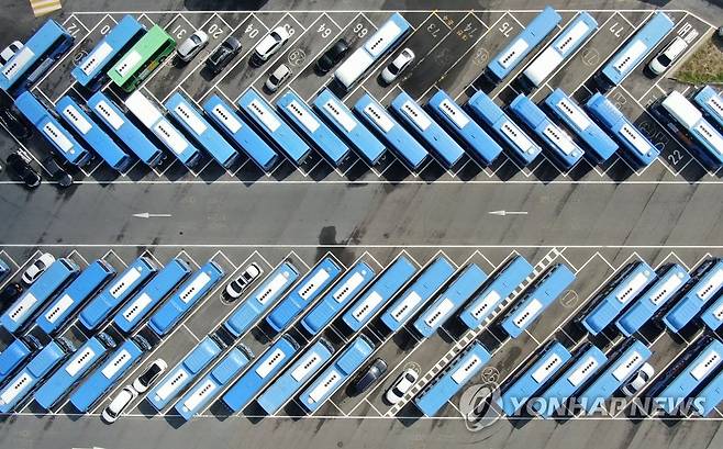 (대전=연합뉴스) 김준범 기자 = 대전시지역버스노동조합이 무기한 파업에 돌입한 30일 오전 대전시 대덕구 읍내동 한 차고지에 시내버스가 주차돼 있다. 2021.9.30