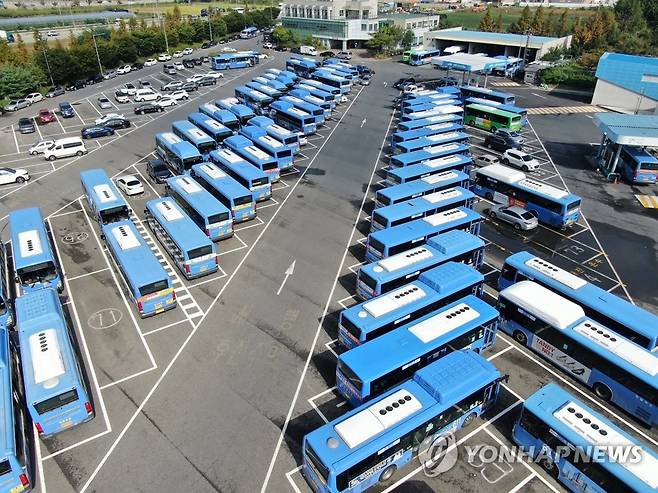 (대전=연합뉴스) 김준범 기자 = 대전시지역버스노동조합이 무기한 파업에 돌입한 30일 오전 대전시 대덕구 읍내동 한 차고지에 시내버스가 주차돼 있다. 2021.9.30