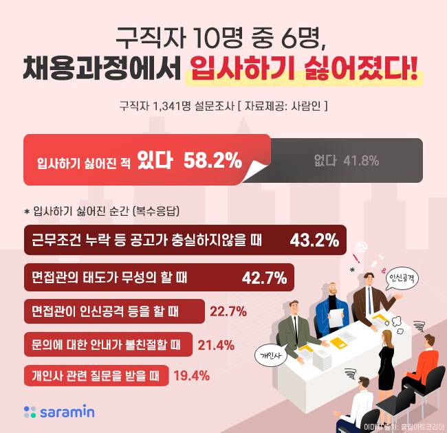 30일 사람인은 구직자 1341명을 대상으로 '입사 과정 중 기업에 실망해 입사 의지가 사라진 경험'을 조사한 결과, 58.2%가 '경험이 있다'고 응답했다고 밝혔다.