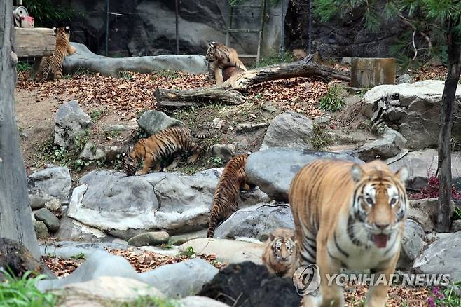 (용인=연합뉴스) 백승렬 기자 = 에버랜드가 지난 6월 27일 태어난 한국호랑이 오둥이를 생후 100일을 나흘 앞둔 30일 경기도 용인 에버랜드 동물원에서 처음 공개했다. 오둥이의 이름은 '아름'·'다운'·'우리'·'나라'·'강산'이다. 2021.9.30