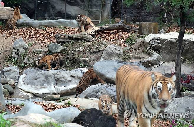 (용인=연합뉴스) 백승렬 기자 = 에버랜드가 지난 6월 27일 태어난 한국호랑이 오둥이를 생후 100일을 나흘 앞둔 30일 경기도 용인 에버랜드 동물원에서 처음 공개했다. 오둥이의 이름은 '아름'·'다운'·'우리'·'나라'·'강산'이다. 2021.9.30