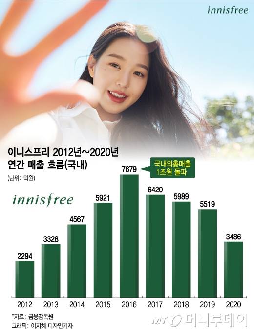 2016년 서경배 아모레퍼시픽 회장은 이니스프리의 총 매출 1조원 돌파를 기념해 임직원들에게 서한을 전했다. 그러나 1조원 매출의 기쁨도 잠시, 한한령(중국 내 한류 금지령)을 겪으며 이니스프리는 중국 시장에서 급격한 내리막길에 접어들었다.
