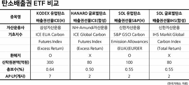 이들은 크게 유럽 탄소배출권 선물에 투자하는 KODEX 유럽탄소배출권선물ICE(H), SOL 유럽탄소배출권선물S&P(H)와 유럽 외 국가를 포함한 글로벌 탄소배출권 선물에 투자하는 HANARO 글로벌탄소배출권선물ICE(합성), SOL 글로벌탄소배출권선물IHS(합성)으로 나눌 수 있다.