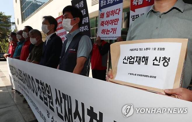 (서울=연합뉴스) 이정훈 기자 = 30일 오전 서울 구로구 근로복지공단 관악지사 앞에서 민주노총 전국민주일반노조 관계자들이 서울대 청소노동자 고 이모 조합원 산재신청 기자회견을 하고 있다.