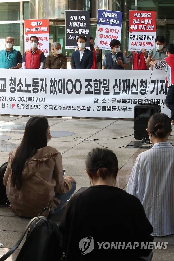 (서울=연합뉴스) 이정훈 기자 = 30일 오전 서울 구로구 근로복지공단 관악지사 앞에서 민주노총 전국민주일반노조 관계자들이 서울대 청소노동자 고 이모 조합원 산재신청 기자회견을 하고 있다.