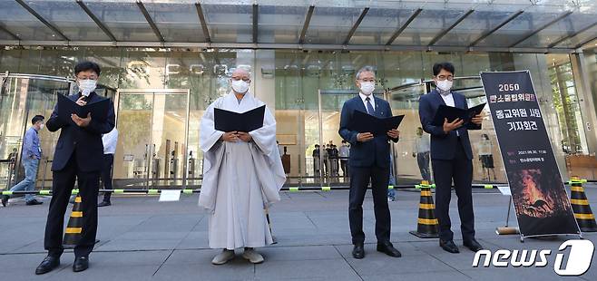 (서울=뉴스1) 박지혜 기자 = 30일 서울 종로구 탄소중립위원회 앞에서 대통령 직속 2050 탄소중립위원회 국민참여분과에 참여한 4대 종단 종교위원들이 사퇴를 선언하고 있다.