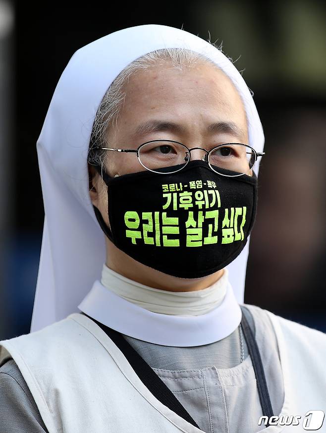 (서울=뉴스1) 박지혜 기자 = 30일 서울 종로구 탄소중립위원회 앞에서 한 수녀가 열린 2050 탄소중립위원회 종교위원 사퇴 기자회견을 지켜보고 있다.