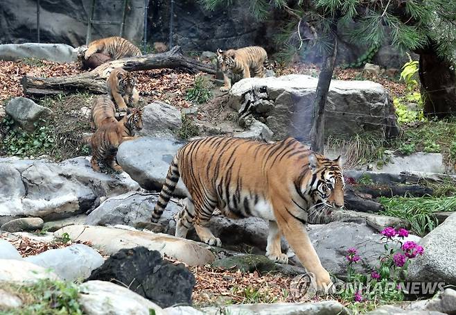 (용인=연합뉴스) 백승렬 기자 = 에버랜드가 지난 6월 27일 태어난 한국호랑이 오둥이를 생후 100일을 나흘 앞둔 30일 경기도 용인 에버랜드 동물원에서 처음 공개했다. 오둥이의 이름은 '아름'·'다운'·'우리'·'나라'·'강산'이다. 2021.9.30