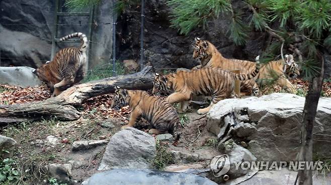 (용인=연합뉴스) 백승렬 기자 = 에버랜드가 지난 6월 27일 태어난 한국호랑이 오둥이를 생후 100일을 나흘 앞둔 30일 경기도 용인 에버랜드 동물원에서 처음 공개했다. 오둥이의 이름은 '아름'·'다운'·'우리'·'나라'·'강산'이다. 2021.9.30