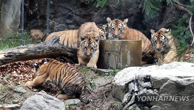 (용인=연합뉴스) 백승렬 기자 = 에버랜드가 지난 6월 27일 태어난 한국호랑이 오둥이를 생후 100일을 나흘 앞둔 30일 경기도 용인 에버랜드 동물원에서 처음 공개했다. 오둥이의 이름은 '아름'·'다운'·'우리'·'나라'·'강산'이다. 2021.9.30