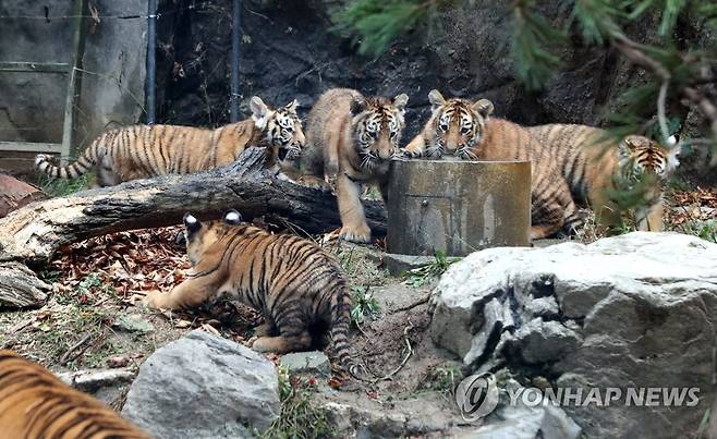 (용인=연합뉴스) 백승렬 기자 = 에버랜드가 지난 6월 27일 태어난 한국호랑이 오둥이를 생후 100일을 나흘 앞둔 30일 경기도 용인 에버랜드 동물원에서 처음 공개했다. 오둥이의 이름은 '아름'·'다운'·'우리'·'나라'·'강산'이다. 2021.9.30