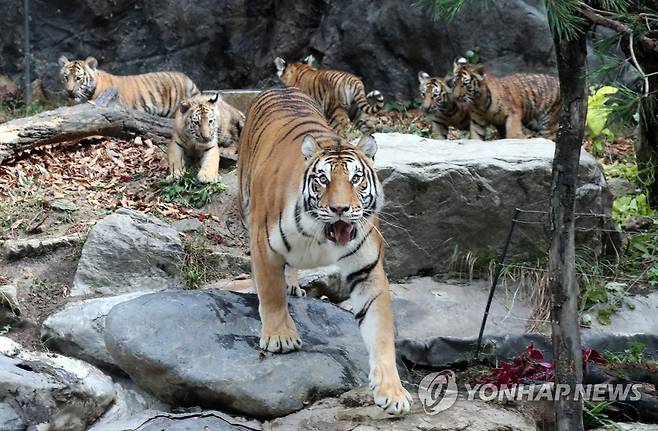 (용인=연합뉴스) 백승렬 기자 = 에버랜드가 지난 6월 27일 태어난 한국호랑이 오둥이를 생후 100일을 나흘 앞둔 30일 경기도 용인 에버랜드 동물원에서 처음 공개했다. 오둥이의 이름은 '아름'·'다운'·'우리'·'나라'·'강산'이다. 2021.9.30