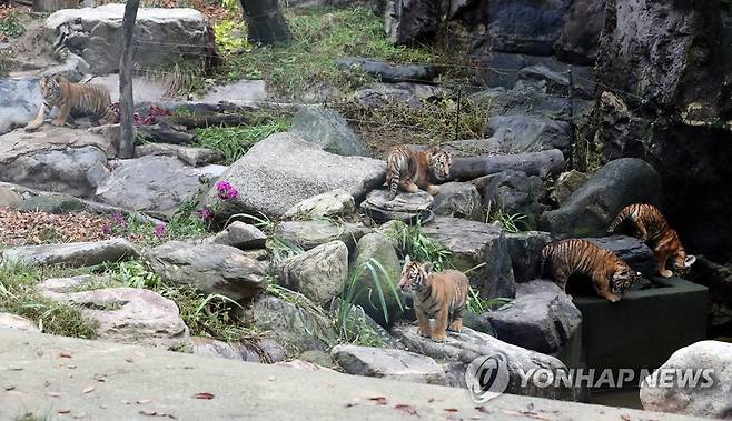 (용인=연합뉴스) 백승렬 기자 = 에버랜드가 지난 6월 27일 태어난 한국호랑이 오둥이를 생후 100일을 나흘 앞둔 30일 경기도 용인 에버랜드 동물원에서 처음 공개했다. 오둥이의 이름은 '아름'·'다운'·'우리'·'나라'·'강산'이다. 2021.9.30