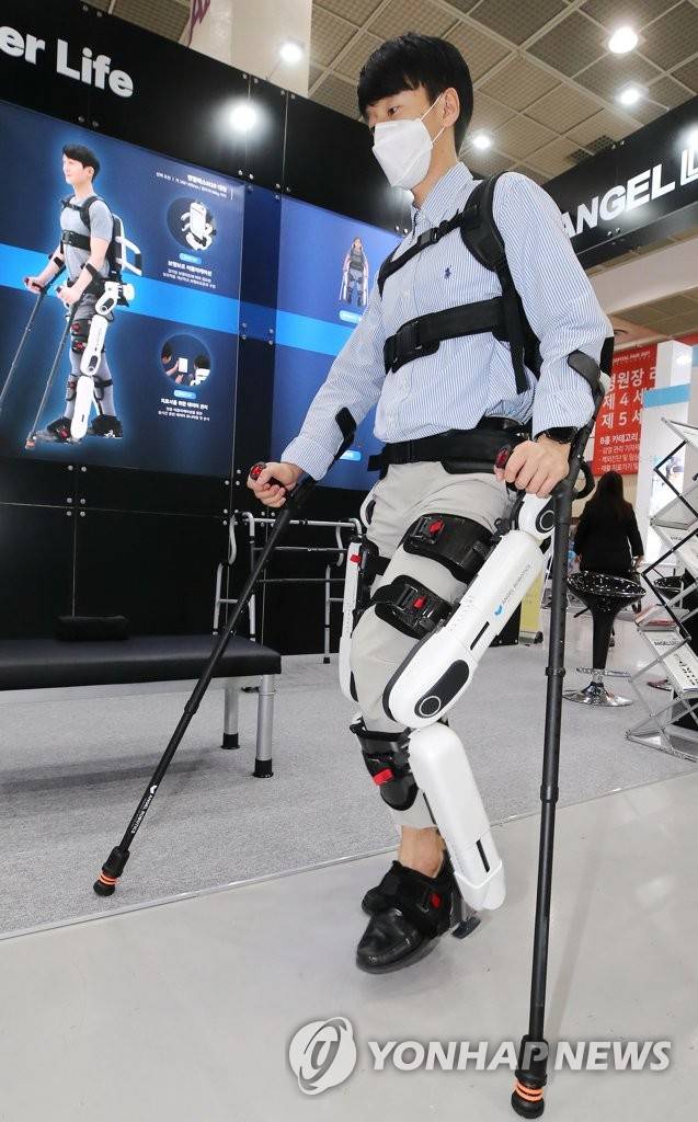 (서울=연합뉴스) 이재희 기자 = 30일 오전 서울 강남구 코엑스에서 열린 '국제병원의료산업박람회' 한 부스에서 관계자가 하지불완전마비환자를 위한 착용형 보행보조로봇을 시연하고 있다. 2021.9.30