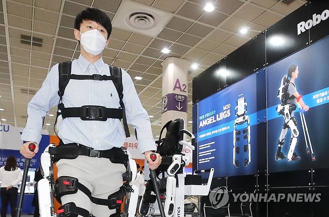 (서울=연합뉴스) 이재희 기자 = 30일 오전 서울 강남구 코엑스에서 열린 '국제병원의료산업박람회' 한 부스에서 관계자가 하지불완전마비환자를 위한 착용형 보행보조로봇을 시연하고 있다. 2021.9.30