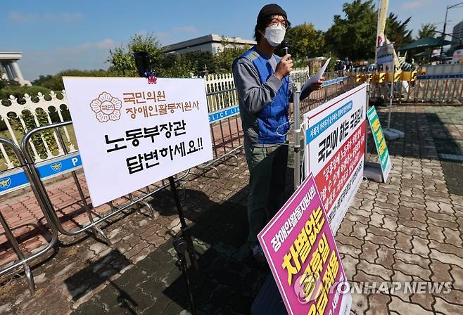 (서울=연합뉴스) 홍해인 기자 = 공공운수노조 전국활동지원사지부와 재가요양지부 주최로 30일 서울 여의도 국회 앞에서 장애인활동지원사와 재가요양보호사의 유급휴일 보장을 촉구하기 위해 고용노동부 장관과 보건복지부 장관을 상대로한 1인 릴레이 기자회견 '국민이 하는 국정감사' 모습을 연출하고 있다. 2021.9.30