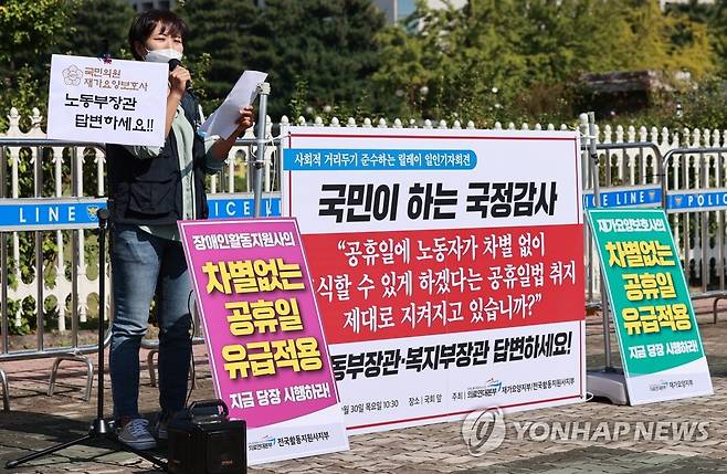 (서울=연합뉴스) 홍해인 기자 = 공공운수노조 전국활동지원사지부와 재가요양지부 주최로 30일 서울 여의도 국회 앞에서 장애인활동지원사와 재가요양보호사의 유급휴일 보장을 촉구하기 위해 고용노동부 장관과 보건복지부 장관을 상대로한 1인 릴레이 기자회견 '국민이 하는 국정감사' 모습을 연출하고 있다. 2021.9.30