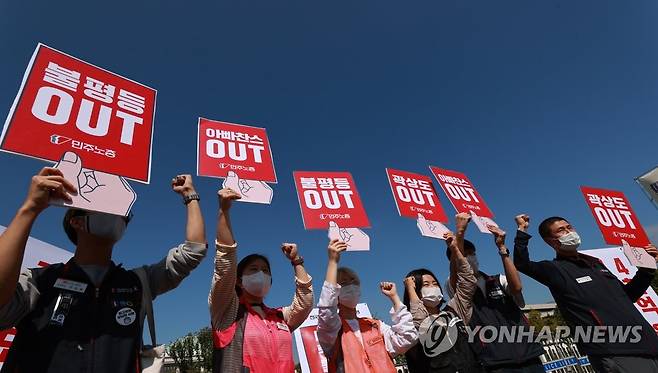 (서울=연합뉴스) 홍해인 기자 = 민주노총 관계자들이 30일 서울 여의도 국회 앞에서 경기도 성남 대장동 개발 관련 의혹의 철저한 수사와 불로소득 환수를 촉구하는 기자회견을 하며 팻말을 들어보이고 있다. 2021.9.30
