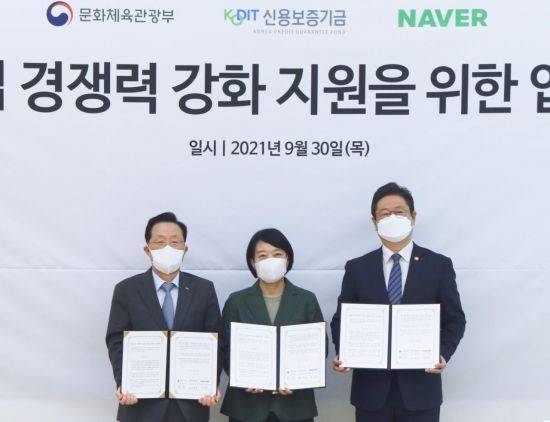 네이버는 30일 문화체육관광부, 신용보증기금과 함께 '문화산업 경쟁력 강화 지원을 위한 업무협약'을 체결했다.