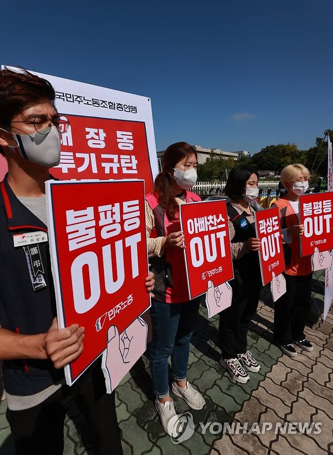 (서울=연합뉴스) 홍해인 기자 = 민주노총 관계자들이 30일 서울 여의도 국회 앞에서 경기도 성남 대장동 개발 관련 의혹의 철저한 수사와 불로소득 환수를 촉구하는 기자회견을 하며 팻말을 들어보이고 있다. 2021.9.30