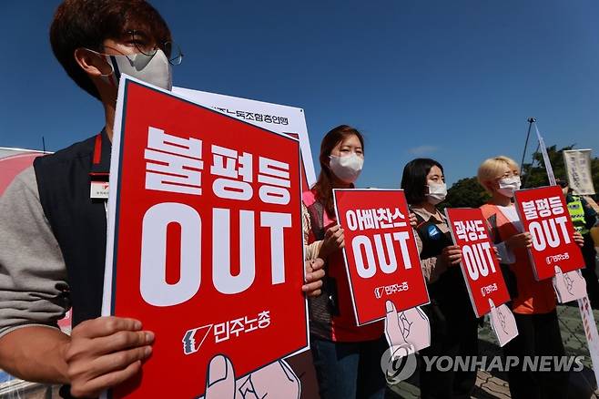 (서울=연합뉴스) 홍해인 기자 = 민주노총 관계자들이 30일 서울 여의도 국회 앞에서 경기도 성남 대장동 개발 관련 의혹의 철저한 수사와 불로소득 환수를 촉구하는 기자회견을 하며 팻말을 들어보이고 있다. 2021.9.30