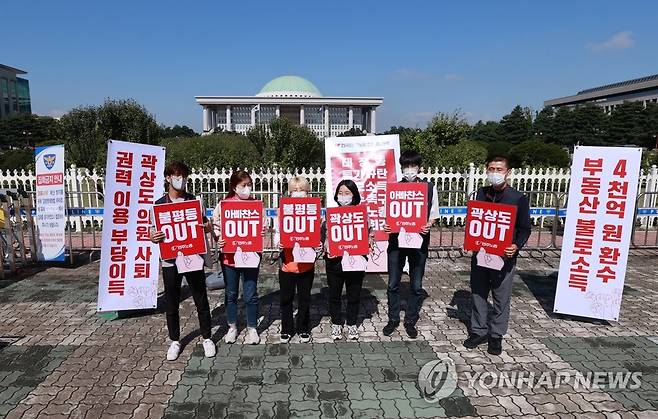 (서울=연합뉴스) 홍해인 기자 = 민주노총 관계자들이 30일 서울 여의도 국회 앞에서 경기도 성남 대장동 개발 관련 의혹의 철저한 수사와 불로소득 환수를 촉구하는 기자회견을 하며 팻말을 들어보이고 있다. 2021.9.30
