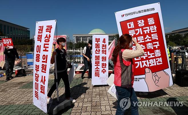 (서울=연합뉴스) 홍해인 기자 = 민주노총 관계자들이 30일 서울 여의도 국회 앞에서 경기도 성남 대장동 개발 관련 의혹의 철저한 수사와 불로소득 환수를 촉구하는 기자회견을 하기 위해 팻말을 들고 회견 장소로 향하고 있다. 2021.9.30