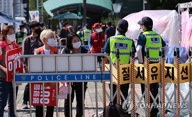 (서울=연합뉴스) 홍해인 기자 = 민주노총 관계자들이 30일 서울 여의도 국회 앞에서 경기도 성남 대장동 개발 관련 의혹의 철저한 수사와 불로소득 환수를 촉구하는 기자회견을 하며 경찰이 지정한 국회 앞 기자회견 장소 질서유지선 밖에서 발언 순서를 기다리며 회견 모습을 바라보고 있다. 2021.9.30
