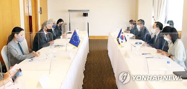 (서울=연합뉴스) 문승욱 산업통상자원부 장관이 30일 서울 중구 롯데호텔에서 티에리 브르통 EU 역내시장 담당 집행위원(장관급)과 면담을 하고 있다. 2021.9.30