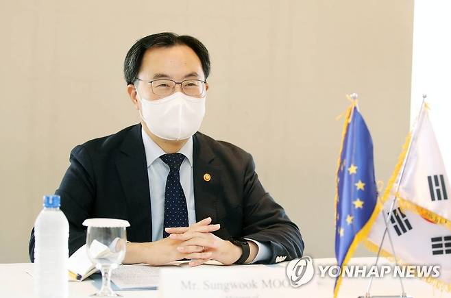 (서울=연합뉴스) 문승욱 산업통상자원부 장관이 30일 서울 중구 롯데호텔에서 티에리 브르통 EU 역내시장 담당 집행위원(장관급)과 면담을 하고 있다. 2021.9.30