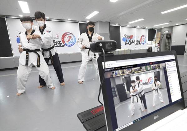 사진은 경기도 용인 소재의 태권도 학원에서 KT 랜선에듀를 이용해 태권도 교습을 진행하고 있는 모습.