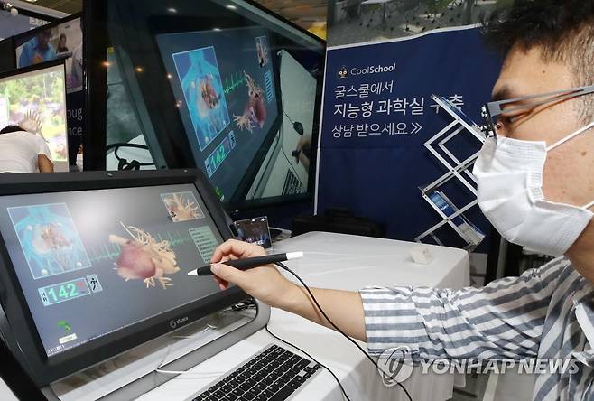 (서울=연합뉴스) 이재희 기자 = 30일 오후 서울 강남구 코엑스에서 열린 '2021 에듀테크쇼+초등교육전' 한 부스에서 AR(증강현실) 기술을 이용한 교육 앱을 시연하고 있다. 2021.9.30