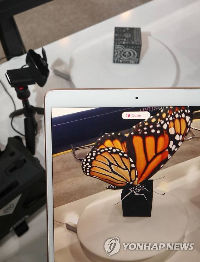 (서울=연합뉴스) 이재희 기자 = 30일 오후 서울 강남구 코엑스에서 열린 '2021 에듀테크쇼+초등교육전' 한 부스에서 가상현실, 증강현실 기술을 이용한 교육 앱을 시연하고 있다. 2021.9.30