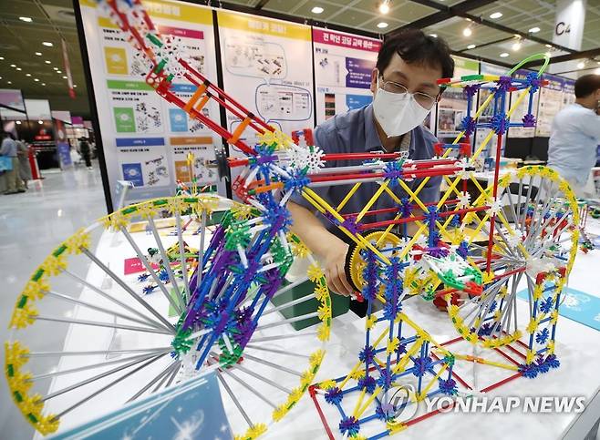(서울=연합뉴스) 이재희 기자 = 30일 오후 서울 강남구 코엑스에서 열린 '2021 에듀테크쇼+초등교육전' 한 부스에서 코딩 블럭으로 만든 장난감을 시연하고 있다. 2021.9.30