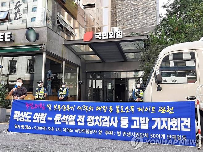 사진은 이날 여의도 국민의힘 당사 앞에서 열린 '대장동 의혹' 곽상도·윤석열 고발 기자회견. 2021.9.30