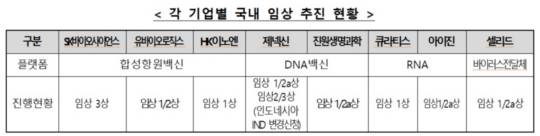 현재 국내에서는 8개 기업이 코로나 백신 임상 진행 중이며(SK바이오사이언스, 유바이오로직스, HK이노엔, 제넥신, 진원생명과학, 큐라티스, 아이진, 셀리드) 가장 빠른 곳은 SK바이오사이언스로 임상 3상 진행 중이며, 나머지 기업도 3상 진입을 준비하고 있다.