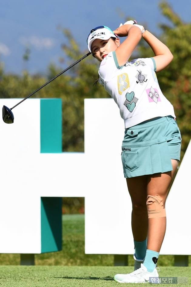 KLPGA(한국여자프로골프)투어 '하나금융그룹 챔피언십'(총상금 15억 원) 1라운드 경기가 30일 경기도 포천시 경기도 포천 아도니스 컨트리클럽(파71·6480야드)에서 열렸다. 대회에 출전한 박현경이 1번 홀에서 티샷하고 있다.