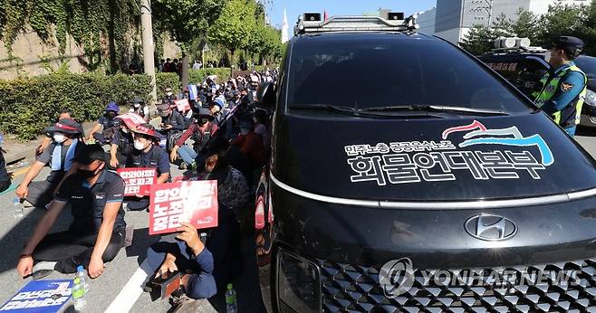 (청주=연합뉴스) 천경환 기자 = 30일 오전 청주시 흥덕구 송정동 SPC삼립 청주공장 앞 도로에서 민주노총 공공운수노조가 결의대회를 열고 있다. 화물연대는 세종공장에서 결의대회를 하려다 강제해산 당하자 청주공장 앞에 재결집해 철야 농성을 벌였다. 이들은 과도한 업무량을 개선하기 위한 증차와 배송노선 조정 등을 요구하고 있다. 2021.9.30
