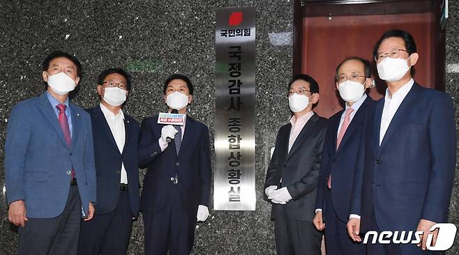 (서울=뉴스1) 오대일 기자 = 김기현 국민의힘 원내대표가 30일 오후 서울 여의도 국회 원내대표실 앞에서 열린 ‘2021 국정감사 종합 상황실’ 현판식에서 인사말을 하고 있다. 2021.9.30/뉴스1