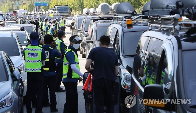 (청주=연합뉴스) 천경환 기자 = 30일 오전 청주시 흥덕구 송정동 SPC삼립 청주공장 앞 도로에서 민주노총 공공운수노조가 결의대회를 열고 있다. 이들은 세종공장에서 결의대회를 하려다 강제해산 당하자 청주공장 앞에 재결집해 철야 농성을 벌였다. 조합원들은 과도한 업무량을 개선하기 위한 증차와 배송노선 조정 등을 요구하고 있다. 2021.9.30