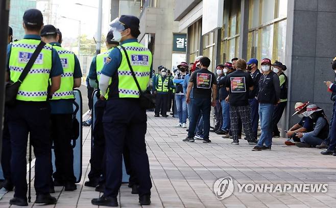 (청주=연합뉴스) 천경환 기자 = 30일 오전 청주시 흥덕구 송정동 SPC삼립 청주공장 앞 도로에서 민주노총 조합원들이 결의대회 전 경찰과 대치하고 있다. 이들은 세종공장에서 결의대회를 하려다 강제해산 당하자 청주공장 앞에 재결집해 철야 농성을 벌였다. 조합원들은 과도한 업무량을 개선하기 위한 증차와 배송노선 조정 등을 요구하고 있다. 2021.9.30