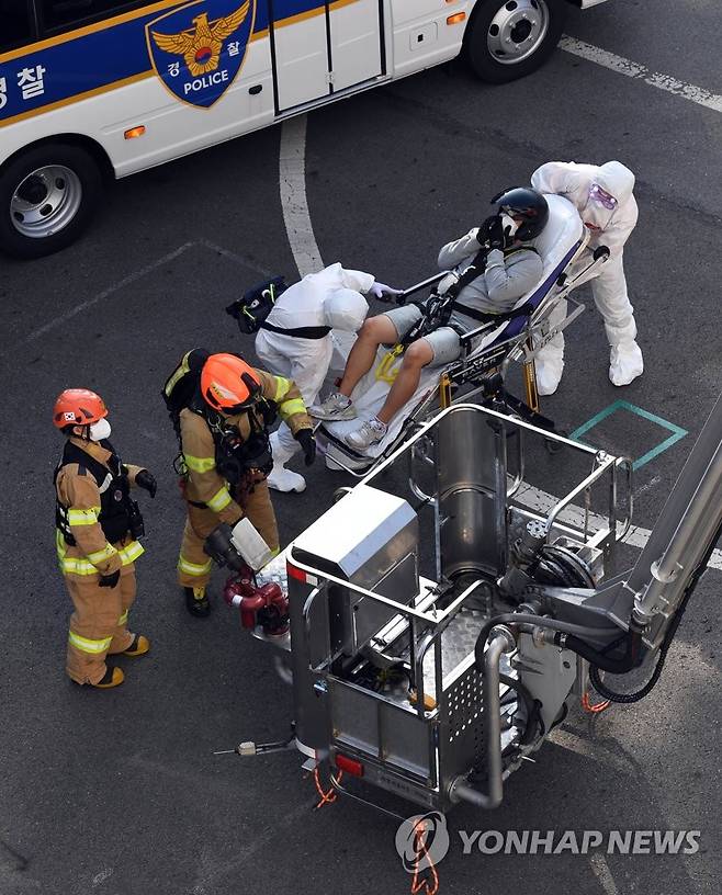 (서울=연합뉴스) 황광모 기자 = 30일 서울 은평구 서울소방행정타운에서 열린 코로나19 관련 시설 화재 대비 및 특수사고 대응 종합훈련에서 구조대원들이 코로나 중증 환자 역할의 참가자를 굴절차를 이용해 구조하는 훈련을 하고 있다. 2021.9.30 [공동취재]