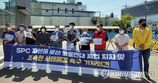 (청주=연합뉴스) 천경환 기자 = 충북의 한 시민단체가 30일 오전 청주시 흥덕구 송정동 SPC삼립 청주공장 앞 도로에서 민주노총 공공운수노조 조합원들의 파업을 지지하는 기자회견을 하고 있다. 2021.9.30 kw@yna.co.kr