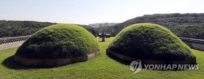 (김포=연합뉴스) 윤태현 기자 = 30일 오후 경기도 김포시 풍무동 장릉에 있는 무덤 사이로 인천 서구 검단신도시 신축 아파트 건설 현장이 보인다. 문화재청은 이들 아파트 단지 3곳의 건설사가 문화재 반경 500m 안에서 공사를 진행해 문화재보호법을 위반했다며 공사 중단 명령을 내렸다. 이에 따라 이날부터 아파트 단지 2곳의 공사는 중단됐지만, 나머지 1곳은 집행 정지 가처분 신청이 인용되면서 공사가 계속되고 있다. 사적 202호이자 유네스코 세계문화유산으로 등재된 김포 장릉은 조선 선조의 5번째 아들이자 인조의 아버지인 원종(1580∼1619)과 부인 인헌왕후(1578∼1626)의 무덤이다. 2021.9.30