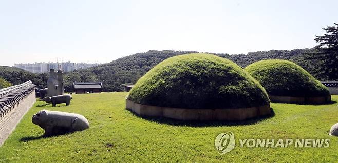 (김포=연합뉴스) 윤태현 기자 = 30일 오후 경기도 김포시 풍무동 장릉 전방에 인천 서구 검단신도시 신축 아파트 건설 현장이 보인다. 문화재청은 이들 아파트 단지 3곳의 건설사가 문화재 반경 500m 안에서 공사를 진행해 문화재보호법을 위반했다며 공사 중단 명령을 내렸다. 이에 따라 이날부터 아파트 단지 2곳의 공사는 중단됐지만, 나머지 1곳은 집행 정지 가처분 신청이 인용되면서 공사가 계속되고 있다. 사적 202호이자 유네스코 세계문화유산으로 등재된 김포 장릉은 조선 선조의 5번째 아들이자 인조의 아버지인 원종(1580∼1619)과 부인 인헌왕후(1578∼1626)의 무덤이다. 2021.9.30