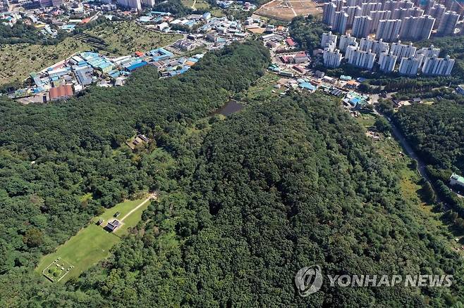 (김포=연합뉴스) 윤태현 기자 = 30일 오후 경기도 김포시 풍무동 장릉 전방에 인천 서구 검단신도시 신축 아파트 건설 현장이 보인다. 문화재청은 이들 아파트 단지 3곳의 건설사가 문화재 반경 500m 안에서 공사를 진행해 문화재보호법을 위반했다며 공사 중단 명령을 내렸다. 이에 따라 이날부터 아파트 단지 2곳의 공사는 중단됐지만, 나머지 1곳은 집행 정지 가처분 신청이 인용되면서 공사가 계속되고 있다. 사적 202호이자 유네스코 세계문화유산으로 등재된 김포 장릉은 조선 선조의 5번째 아들이자 인조의 아버지인 원종(1580∼1619)과 부인 인헌왕후(1578∼1626)의 무덤이다. 2021.9.30