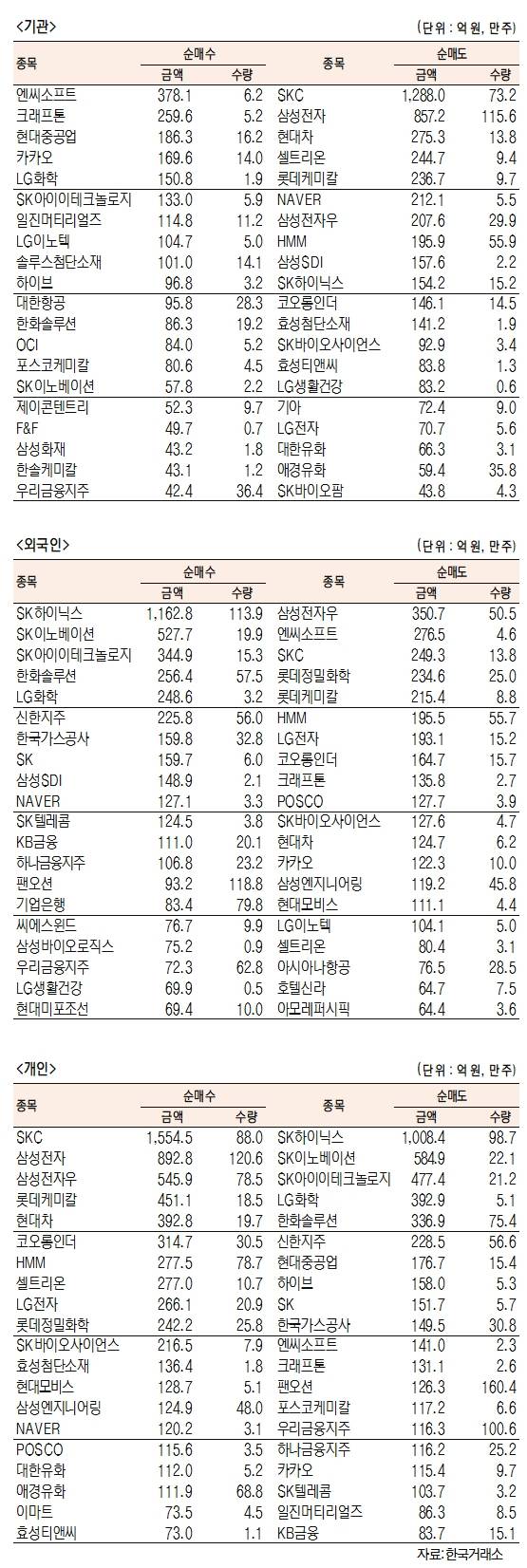 [표]유가증권 기관·외국인·개인 순매수·도 상위종목(9월 30일)